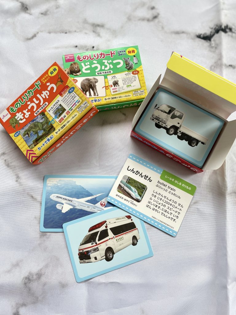 乗り物からフルーツ、お野菜など多くのジャンルの絵カードが入っています。